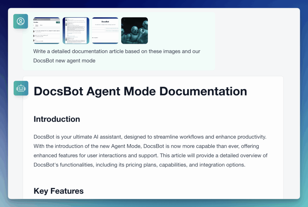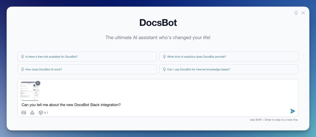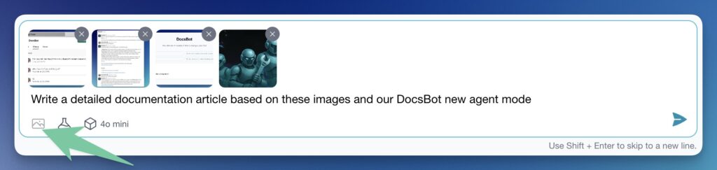 Your DocsBot dashboard chat window is now powered by our new Agent mode, which provides more intelligent and contextual responses, tool calling to perform actions, as well as image and model selection support! We’ll share more details about that soon, but today it comes with two powerful new controls that put you in complete command of every conversation. The Model Switcher lets you swap between any connected model on the fly—perfect for balancing speed, cost, and accuracy without ever leaving the thread. Right next to that, you can now add images for visual input, making your chats truly multimodal!