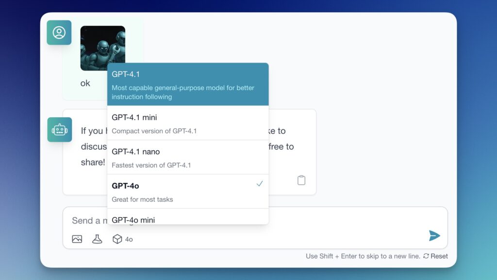 At the bottom of the chat window, you’ll see the currently selected model (e.g., 4.1). Click the model icon to view and switch between options like GPT-4.1, GPT-4.1 mini, or GPT-4o. We plan to add support for reasoning models like o3 and o4-mini soon as well! - That’s It—Start Chatting!