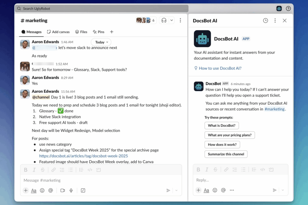 DocsBot now lives inside Slack. Instead of switching tabs or platforms, your team can: