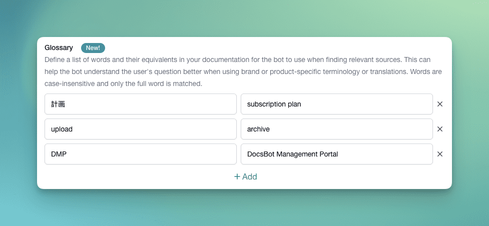 Your DocsBot can now understand brand lingo, nicknames, and industry terms—even if they don’t appear verbatim in your docs.