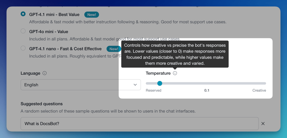Changing your agent’s temperature in DocsBot is refreshingly simple: