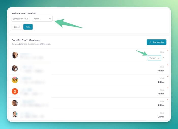 - Enter the team member’s desired role (Admin, Editor, Viewer).