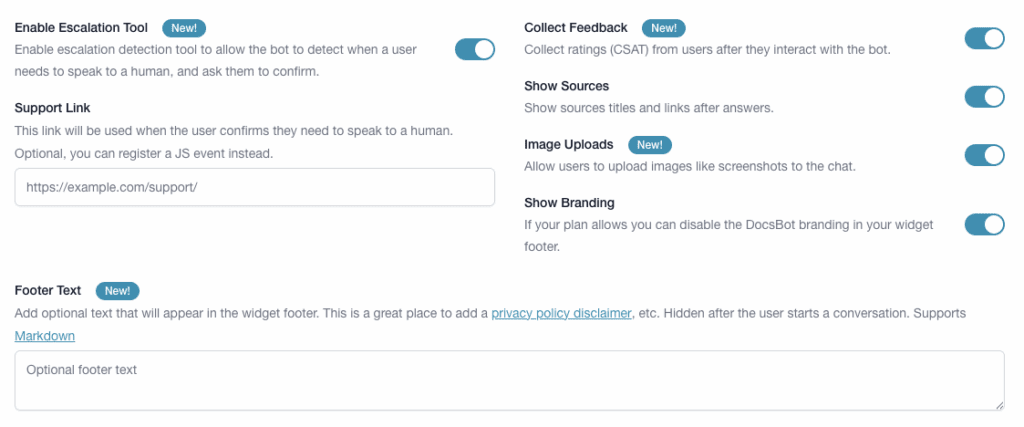 You can now customize the widget’s footer text to reflect your brand voice or compliance needs. Add your company name, legal disclaimers, or trust-building CTAs. And it supports full Markdown formatting like links, bold, italics, etc.
