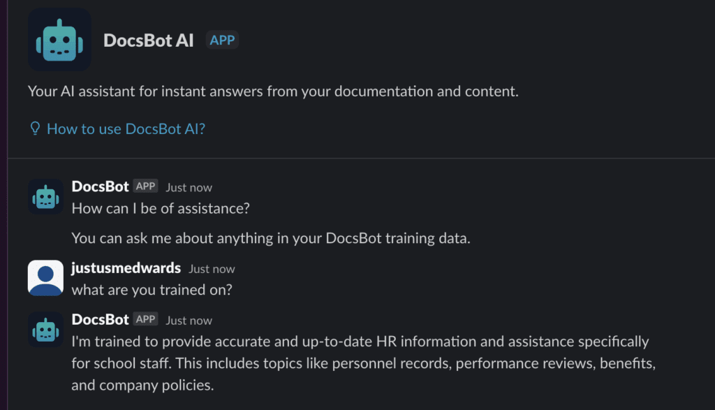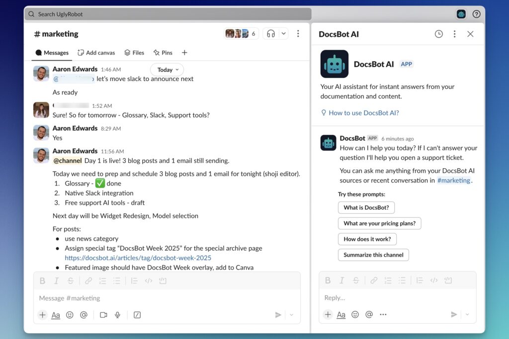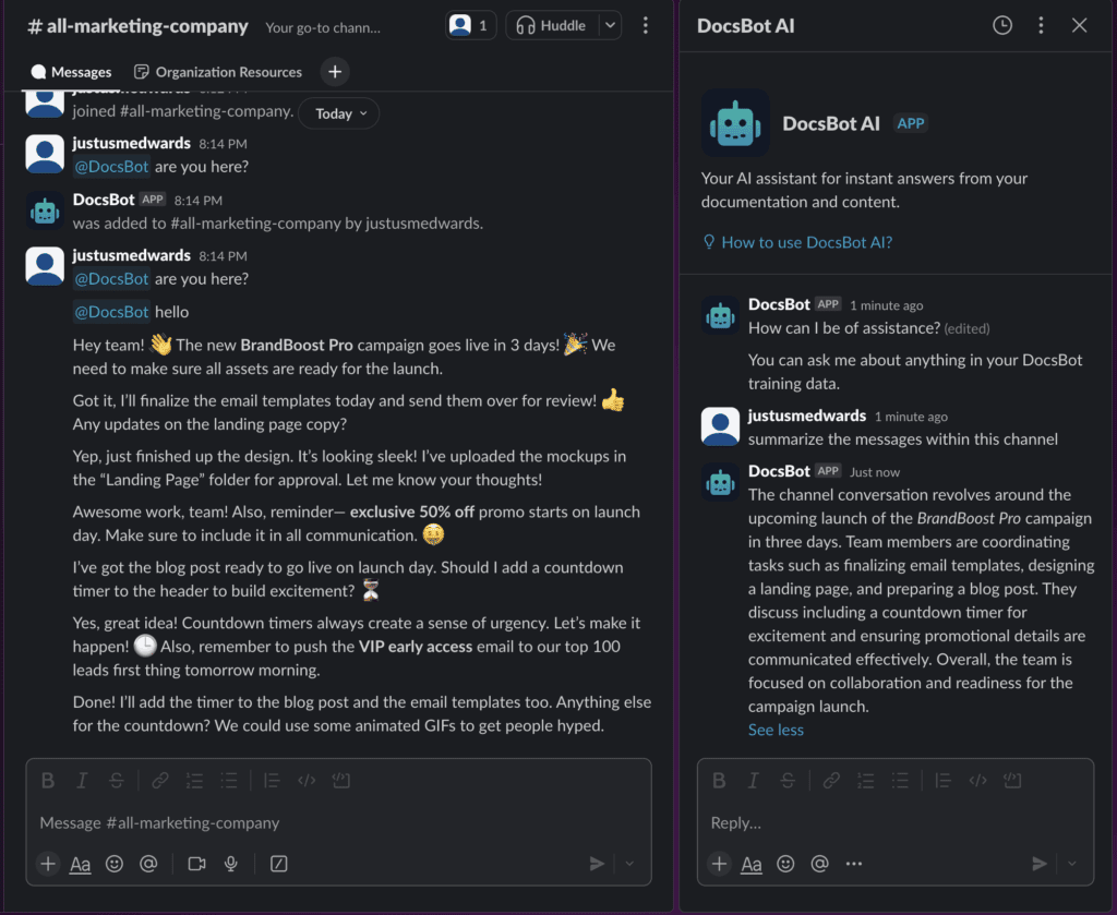 By integrating DocsBot into your Slack workspace, you’ve taken a significant step toward streamlining communication and improving productivity. With features like App Mode for quick access and Split View for dynamic, real-time assistance, DocsBot becomes your personal AI assistant. Adding DocsBot to your channels enables even deeper engagement, where it can analyze and respond based on Slack conversations. This integration makes it easier to get the most out of your Slack experience.