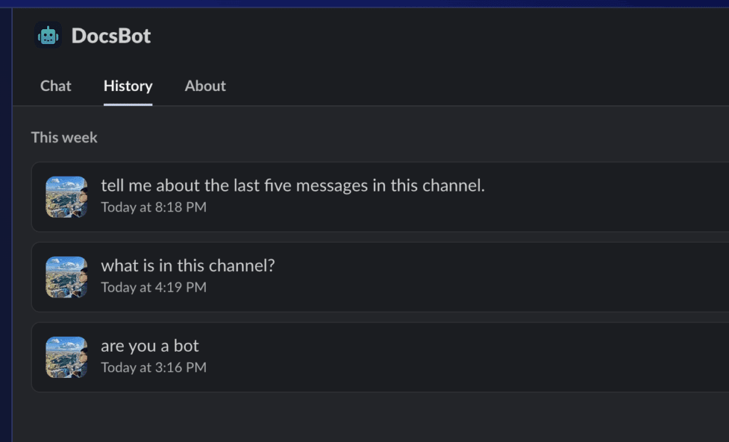 In you can also see the history of all your conversations with DocsBot in Slack. You can do this by selecting the “History” tab. That way you’ll never lose your important conversations and answers.