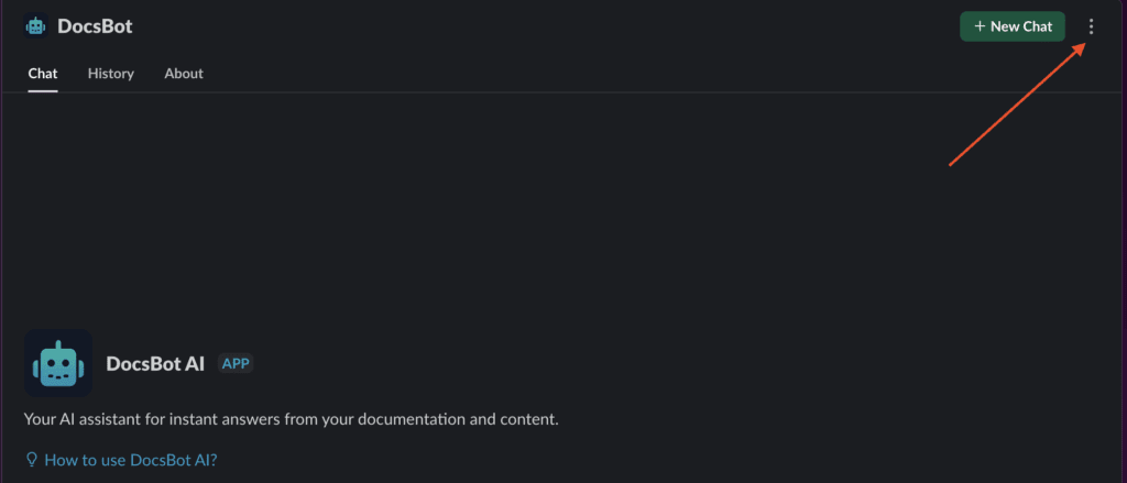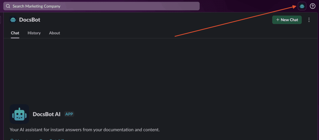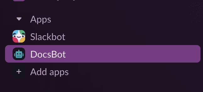 Select DocsBot from the Apps Tab on your Slack sidebar, or start a new DM with @DocsBot.