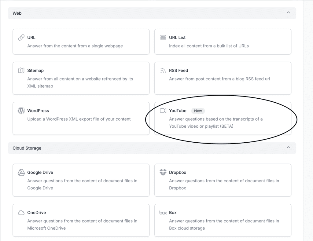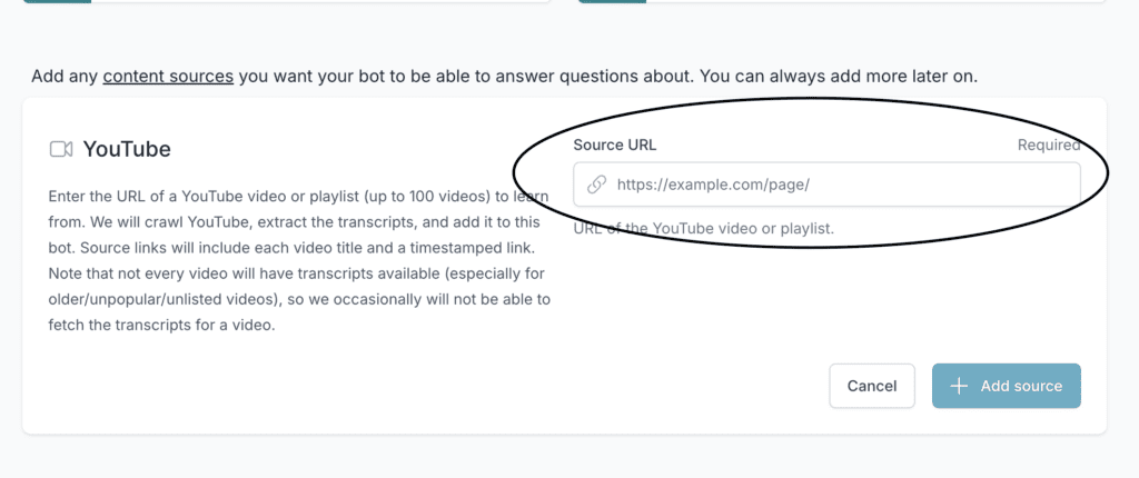 Enhance your bot’s knowledge by training it with YouTube videos. Adding video content helps your bot learn from transcripts, improving its ability to provide accurate and detailed responses.