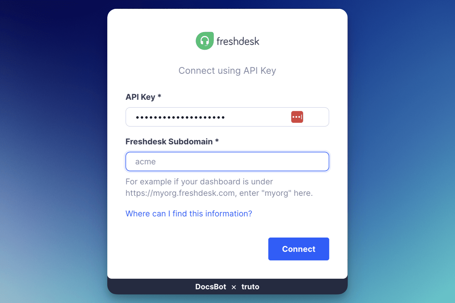 Enter the Freshdesk API Key and subdomain of the account you wish to connect.