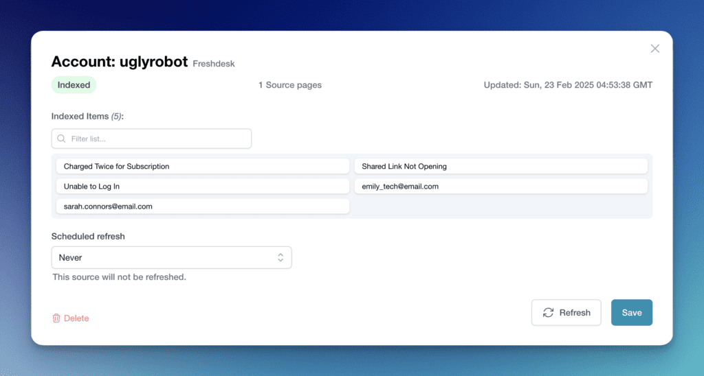 We will show you the progress of the sync in your dashboard. When complete, you can click on the source to see the indexed conversations by subject and url.