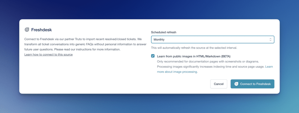 Welcome to the comprehensive guide on training your AI chatbot with Freshdesk past tickets as a source! In this guide, we’ll take you through the steps to effectively train your chatbot, empowering it to provide accurate and pertinent responses sourced from your Freshdesk conversation history. This method allows you to harness the wealth of information in your Freshdesk account, crafting a tailored chatbot experience that excels in aiding and addressing user inquiries across various domains, including research, customer support, and more.