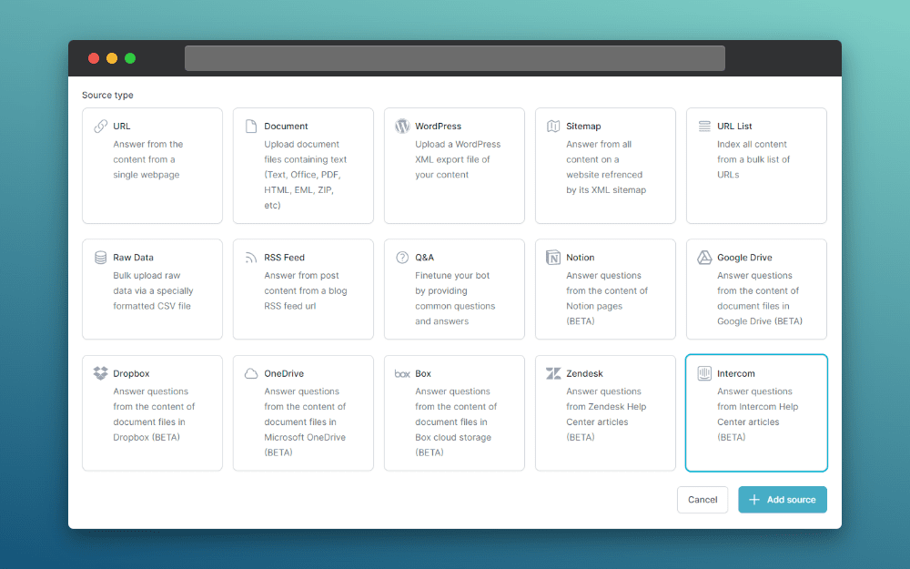 Navigate to “New Source” button to open the list of possible sources to train your bot from.