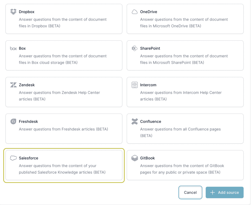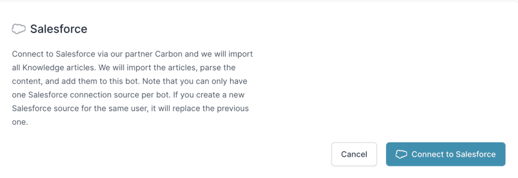 Once connected, DocsBot AI will synchronize all published articles from a single Salesforce knowledge base. Note that any draft articles will not be synced. This allows your chatbot to access a vast repository of information, enhancing its ability to provide accurate and helpful responses directly through your website’s chat widget.