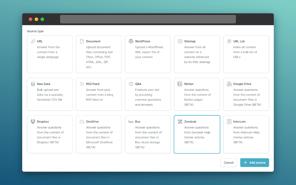 Click the “New Source” button to explore possible document sources for training your chatbot.