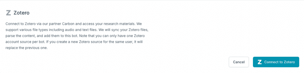 Connecting your Zotero account to DocsBot is an effective way to enrich your bot’s knowledge base by incorporating references, research, and academic sources stored in Zotero. This guide will walk you through the process of linking Zotero with DocsBot, enabling your bot to access and utilize the valuable data you’ve collected. By following these steps, you’ll ensure your bot is equipped to provide well-informed responses based on your Zotero library.
