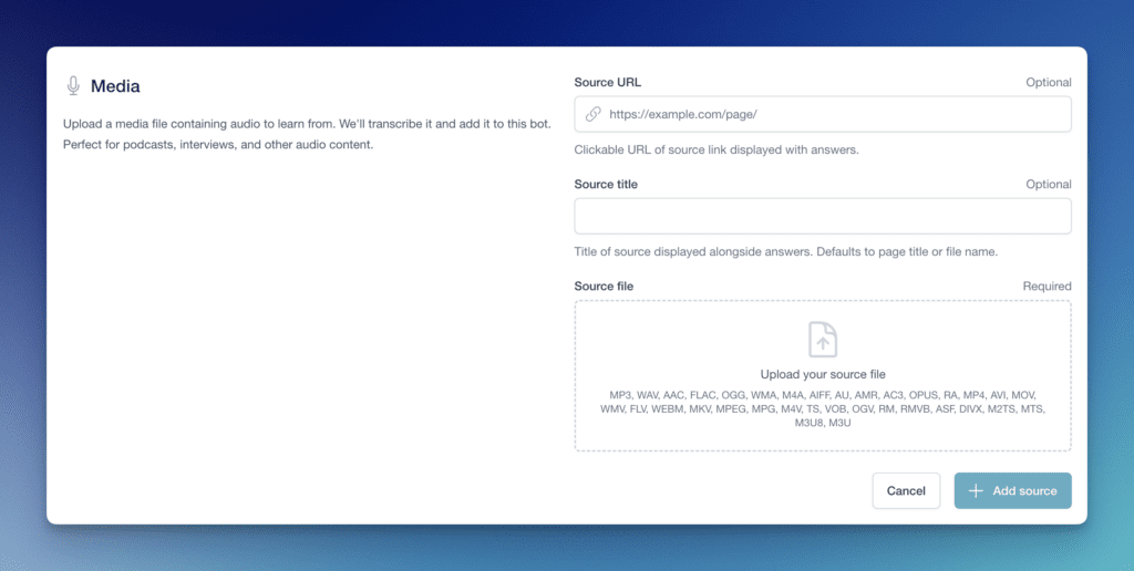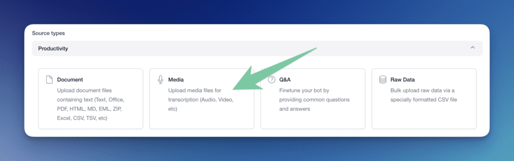 Training a DocsBot on media files allows it to process and interact with audio and video content like MP3s, MP4s, and more. By feeding it these files, you can enable your bot to transcribe, summarize, and answer questions based on the media, enhancing user engagement and accessibility. This guide will show you how to train your DocsBot to on your media effectively.
