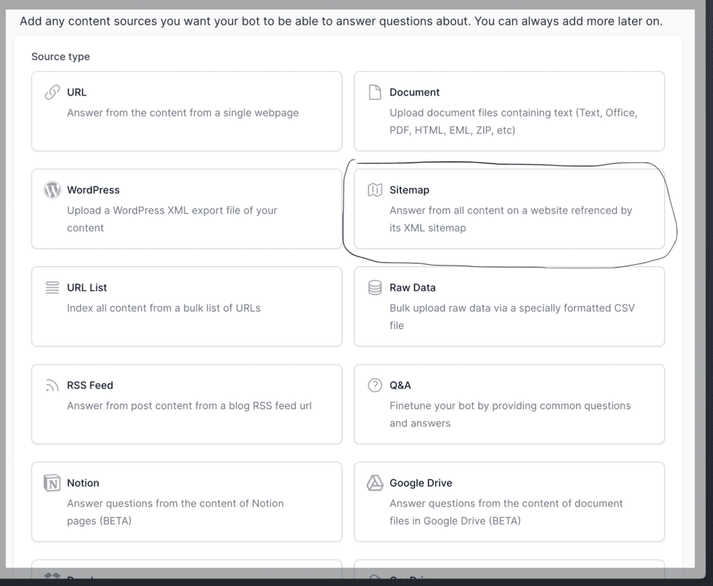 - Click on the “New Source” button to explore data source options for training your bot.
