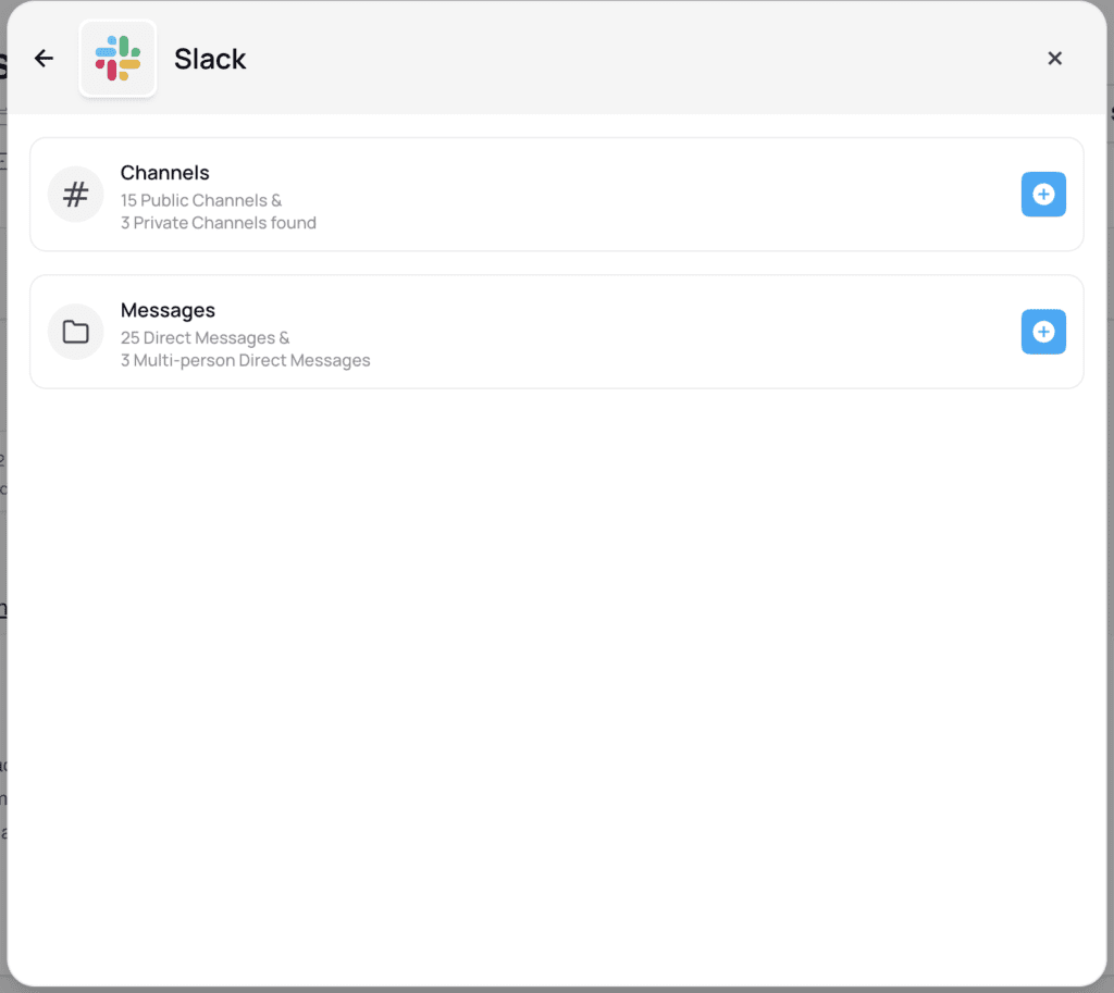After connecting, you’ll see an interface that allows you to choose the type of Slack data to sync. You can select from: